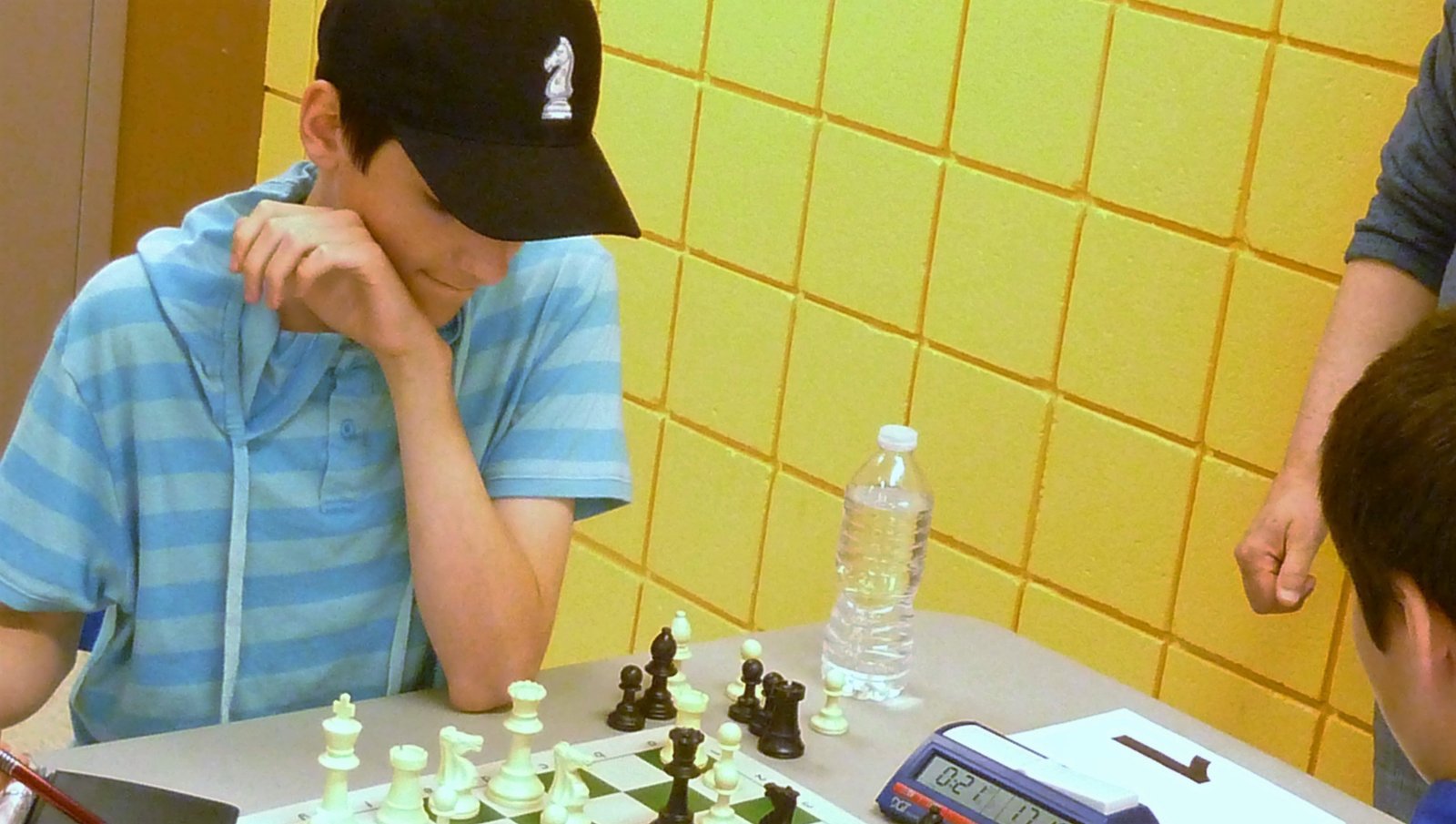 Le tournoi Jeunesse a donné lieu à plusieurs affrontements tendus où la nervosité des participants et participantes jouait un rôle aussi considérable, sinon plus, que les coups portés sur l’échiquier. Le joueur qui semble avoir le mieux maîtrisé ses nerfs et démontré son expérience dans les circonstances fut Étienne Latreille, dont la cote FQE avant le tournoi s’établissait à 1596. Sa partie contre Santiago Pascual-Meagher (2ème place) est un exemple de calme et d’opportunisme.