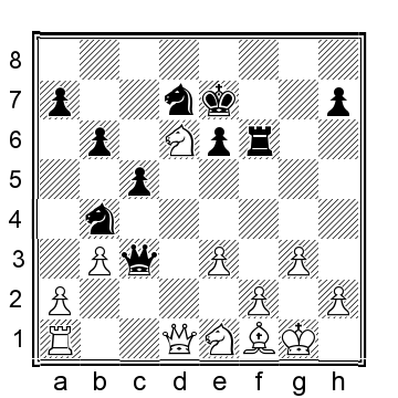 21. Nd6+ Ke7 {Observez la position ci-contre et essayez d’identifier le 22ème
